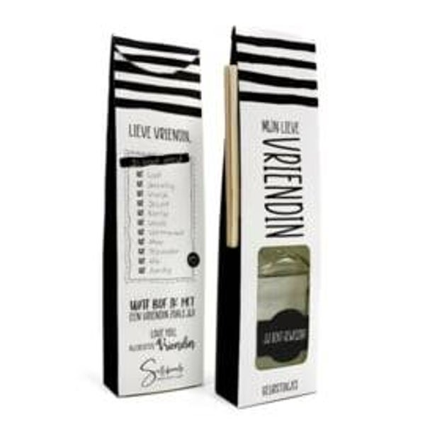 Geurstokjes verpakt in een mooie zwart/wit verpakking met lieve tekst. Kijk ook even naar de achterkant.