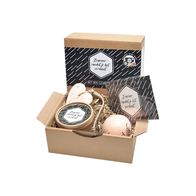 Een hele leuke giftbox, een mooie kartonnen box gevuld met een soap in a bowl met hartzeep aan touw, een geurkaart en een bruisbal van 180 g