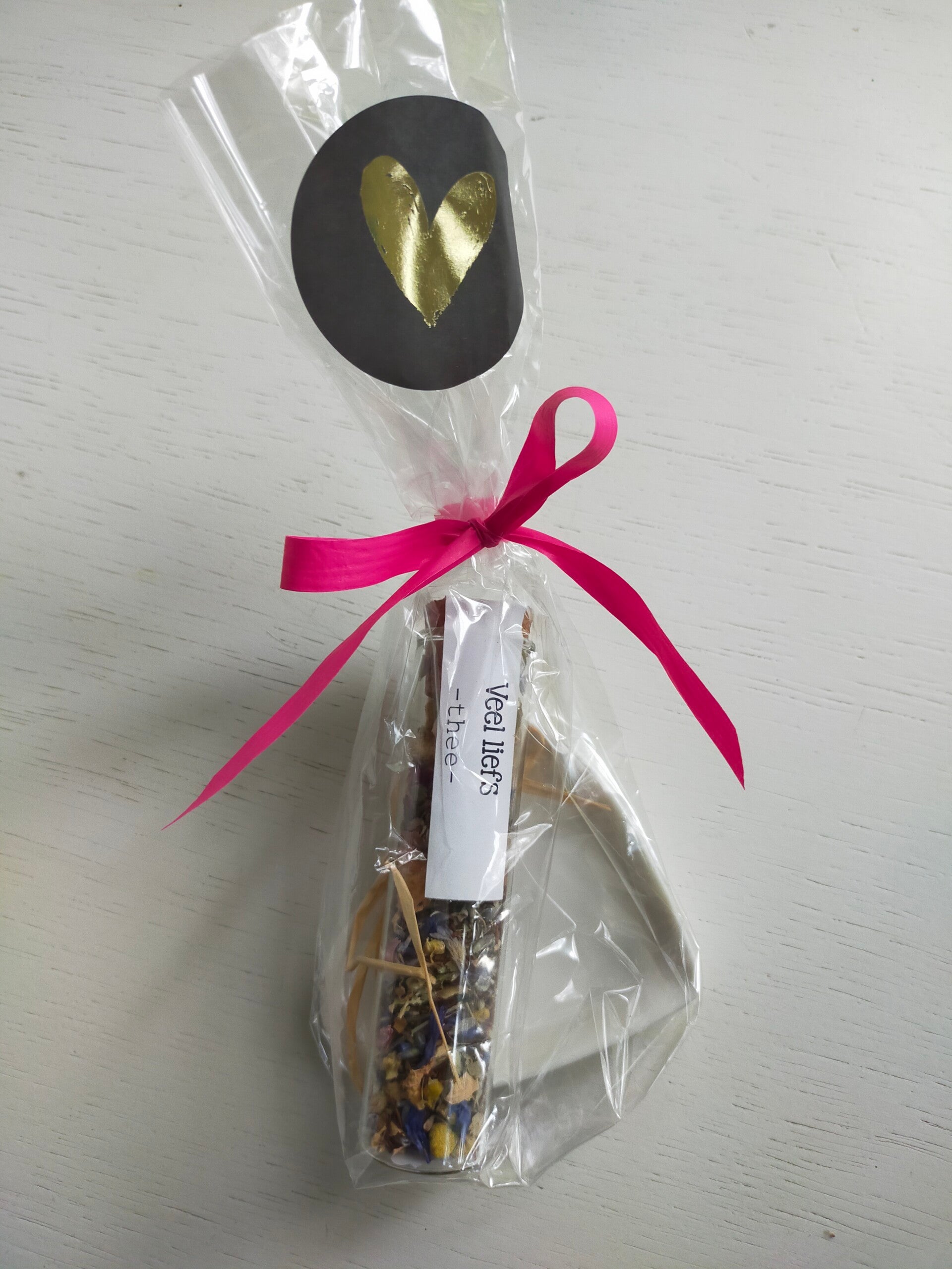 Leuk pakketje, tekstbuisje met verse thee en theetip.