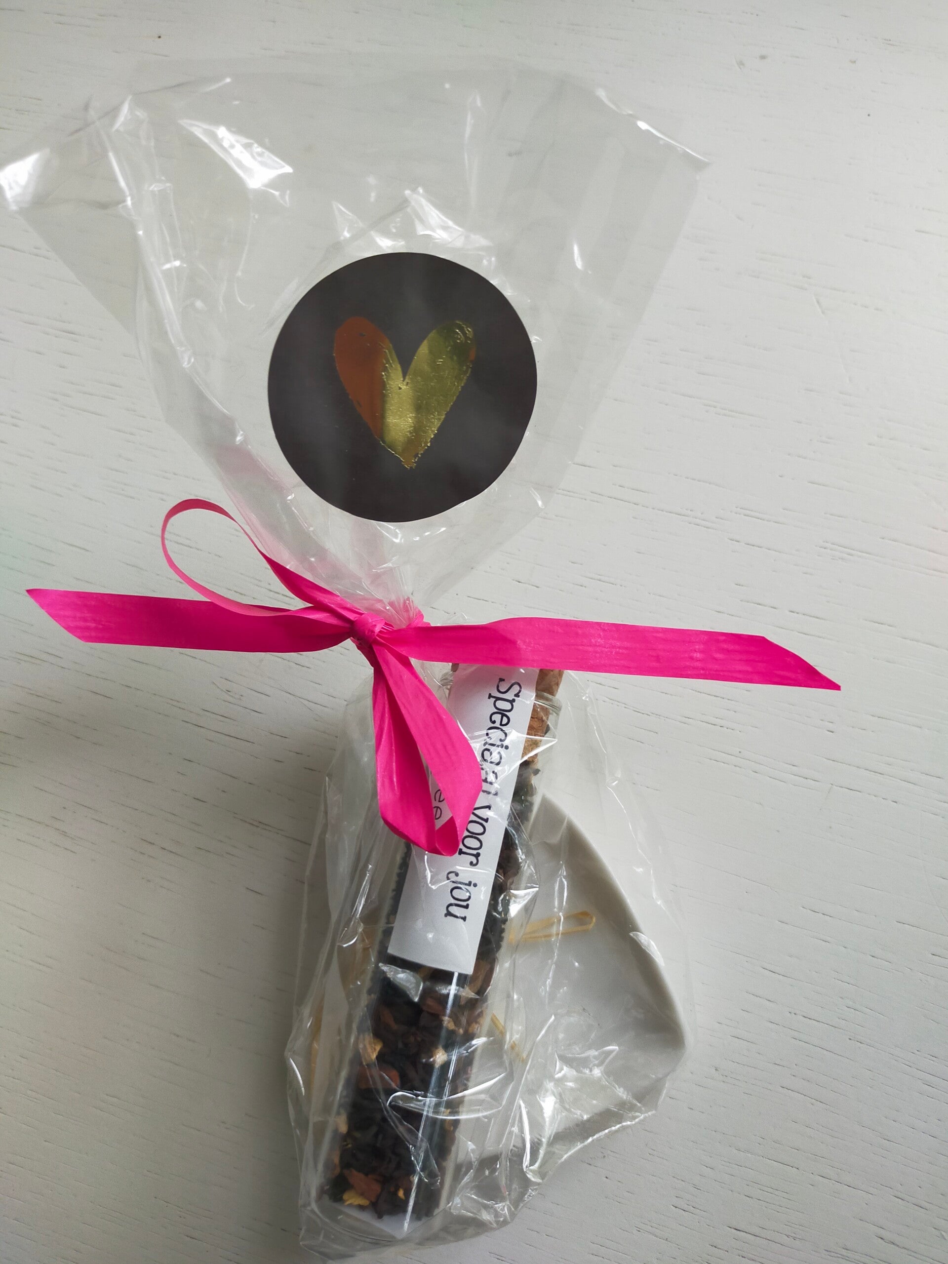 Leuk pakketje, tekstbuisje met verse thee en theetip.