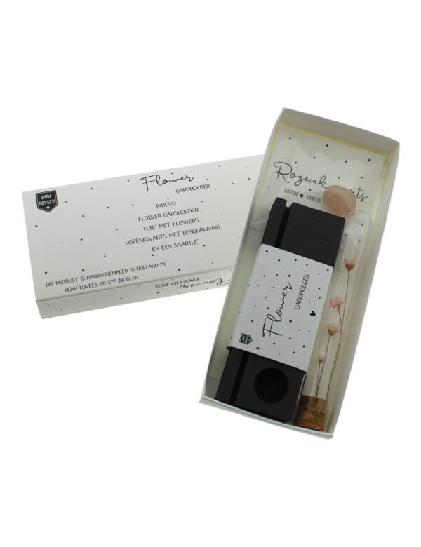 Mooi stevig doosje gevukd met een zwart MDF kaarthouder, formaat 100 x 35 x 18 mm, een glazen buisje gevuld met roze droogbloemen welke in de kaarthouder past. Rozenkwarts met kaartje met daarop de beschrijving. En een kaartje om in de houder te plaatsen met de tekst van fe voorkant van het doosje.