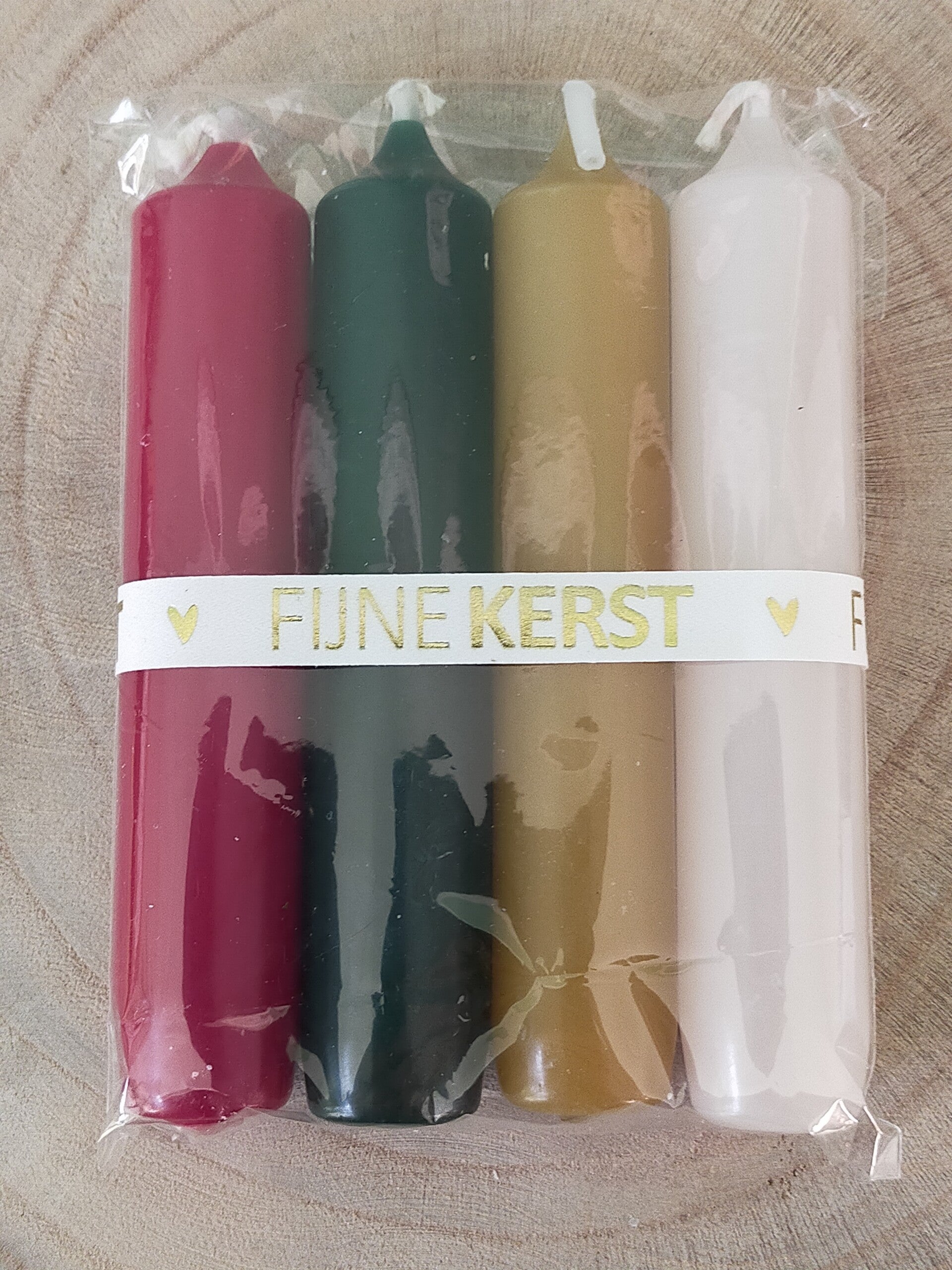 Kaarsenset van 4 kaarsen in lichte kleuren. Met tekstlint, fijne kerst.