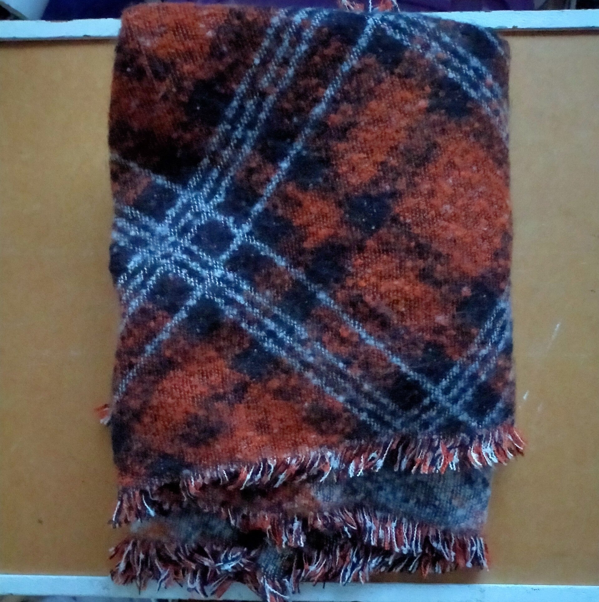 Oranje met zwart en off white. Rondom de sjaal korte franjes