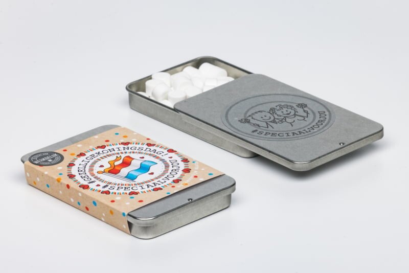 Het blikje is gevuld met suikervrije smintjes en is hervulbaar.