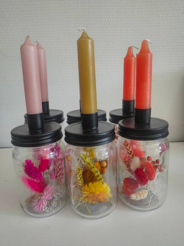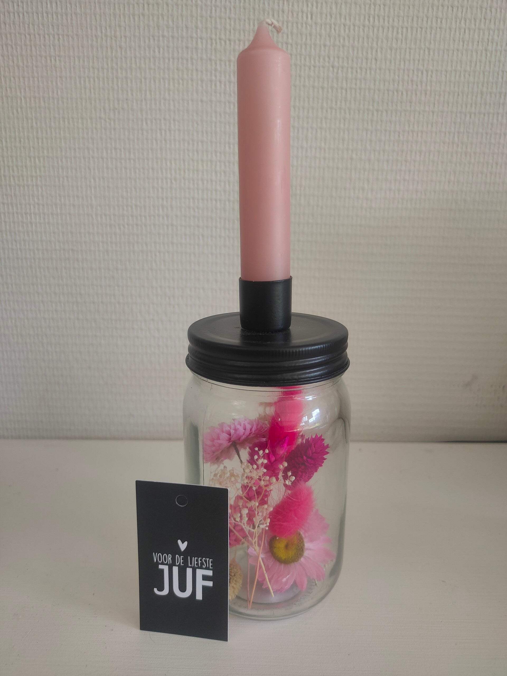 Leuke pot, gevuld met droogbloemen, met schroefdop. Hierin een kaars.