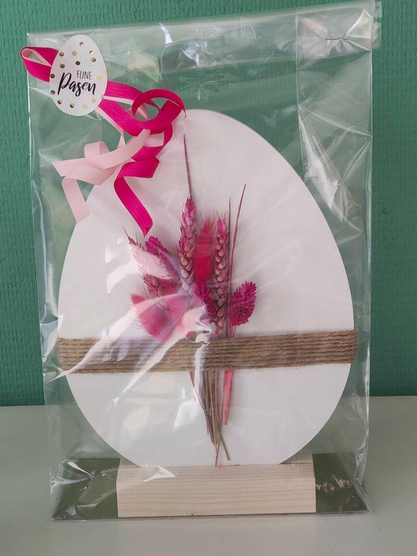 Speciaal voor Pasen dit leuke ei van forex, voorzien van droogbloemen, met houten standaard.
