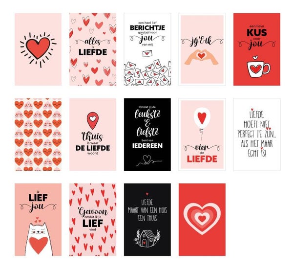 Doosje met een Glimlach 'Liefde'. Een kraft doosje met 14 enkele kadokaartjes op stevig papier met een lieve tekst of illustratie.