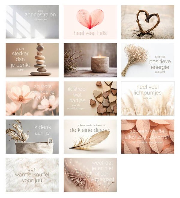 Positieve woorden omringd met prachtige afbeeldingen geven steun en kracht op momenten dat je ze nodig hebt. Een mooi bewaardoosje met 14 lieve, bemoedigende kaartjes. Kaartjes met teksten om je 14 dagen lang te doen beseffen dat je er niet alleen voor staat.