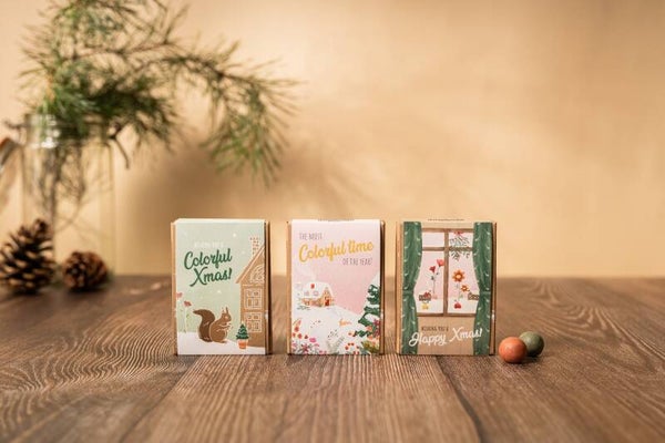 Breng kleur in de feestdagen met de Blossombs Gift Box Mini - "Merry Christmas & Happy New Year ". Deze box bevat 4 zaadbommetjes gevuld met biologische wilde bloemzaden, perfect om een vleugje natuur cadeau te geven!