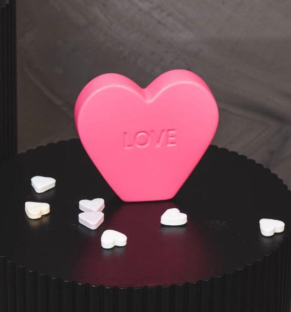 VOLG JE HART Op zoek naar een statement met een speelse touch? Dit roze keramische ornament met tekst is precies wat je nodig hebt. Het is gebaseerd op de bekende hart snoepjes met tekst.