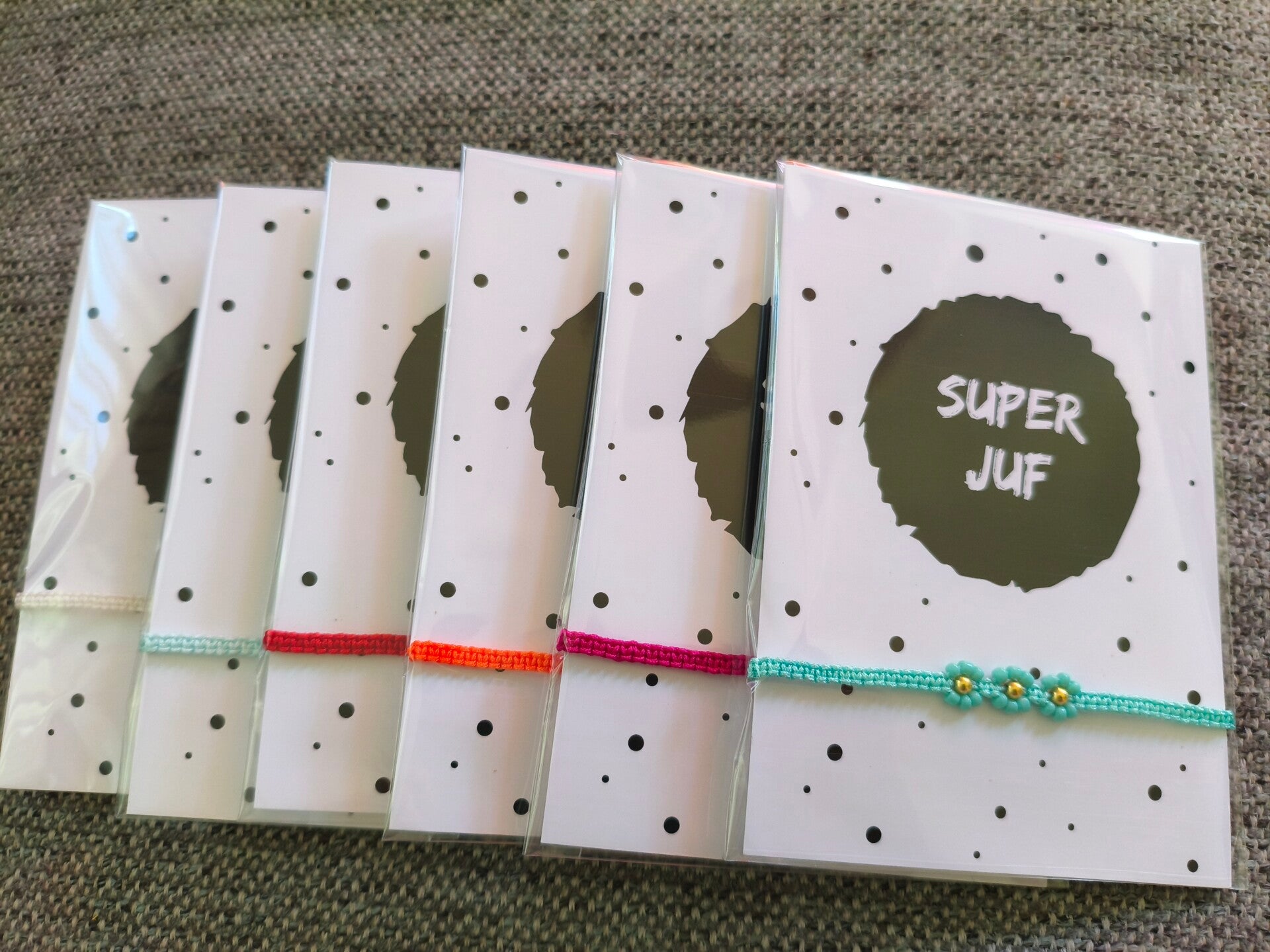 Lief bloemen armbandje, deze kun je zelf op maat maken. Op een kaart met de tekst super juf. Achterop kun je dan nog leuks schrijven/ tekenen voor de juf.