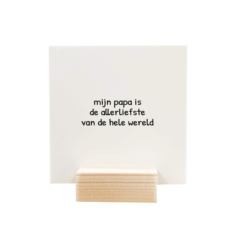 Je ontvangt één houdertje, gemaakt van duurzaam hout, met daarin een stevig Forex bordje van 9 x 9 cm