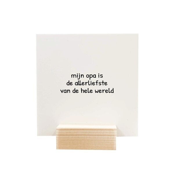 Je ontvangt één houdertje, gemaakt van duurzaam hout, met daarin een stevig Forex bordje van 9 x 9 cm