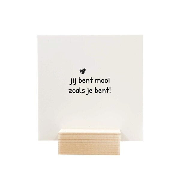 Je ontvangt één houdertje, gemaakt van duurzaam hout, met daarin een stevig Forex bordje van 9 x 9 cm
